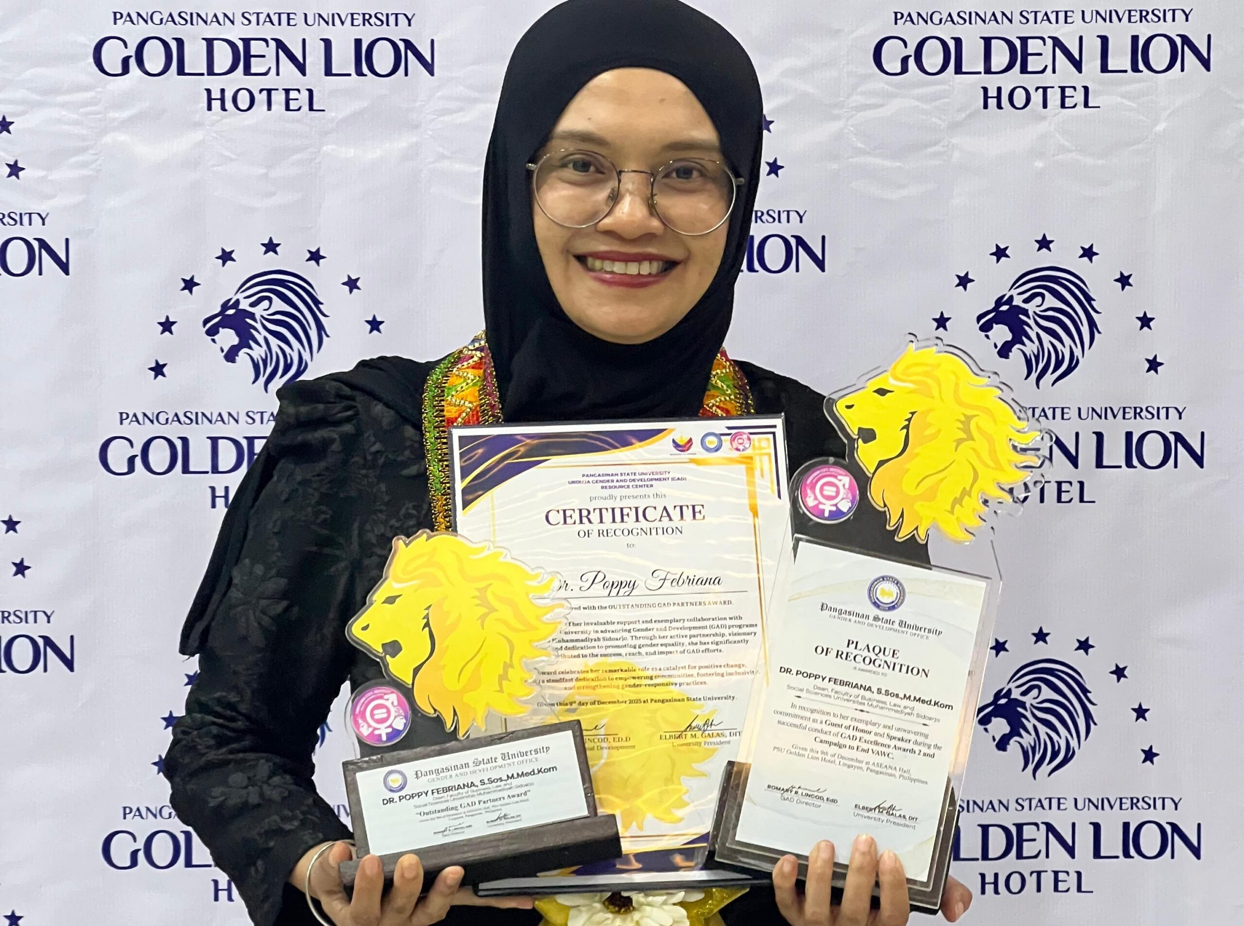 Fbhis.umsida.ac.id – Dekan Fakultas Bisnis, Hukum, dan Ilmu Sosial Universitas Muhammadiyah Sidoarjo (FBHIS Umsida), Dr Poppy Febriana MMedKom, meraih penghargaan Outstanding GAD Partners Award dari Pangasinan State University (PSU), Filipina.